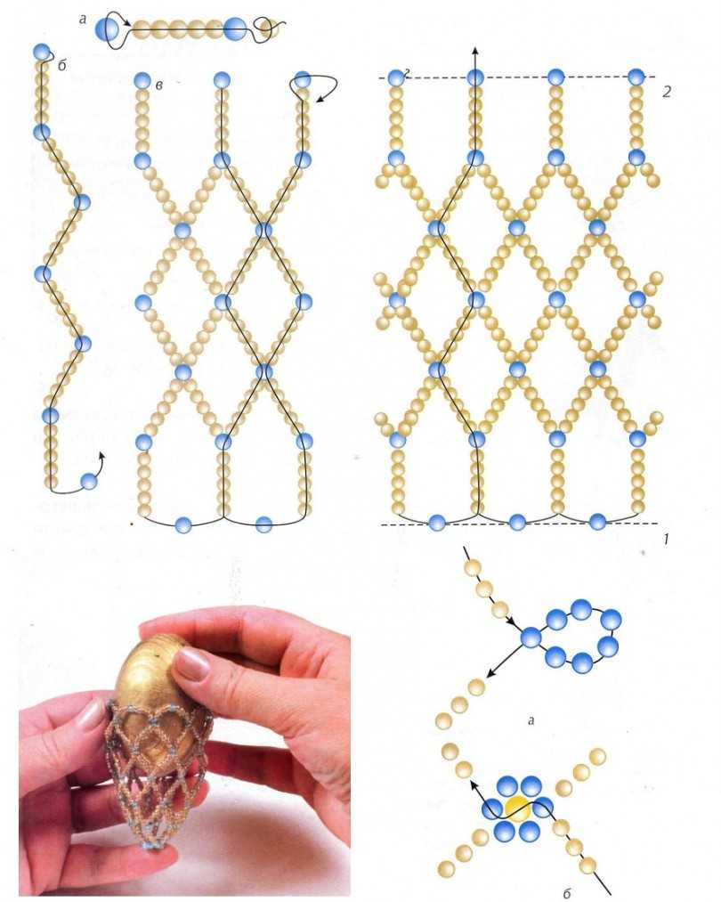 5. Измеряем сантиметровой лентой окружность яйца и его длину (без острой части). В данном случае, это 14*4 см. 2 иглы вдеваем в одну длинную нить, с двух противоположных концов. Нанизываем на одну из них золотистую бусину и тянем до середины нитки. Схему, которую мы также детально обсудим ниже, вы можете посмотреть на фото выше.