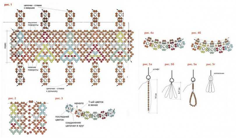 Далее продеть иголку в бусину на конце пояса, соответствующую цвету 4 бисеринки.
