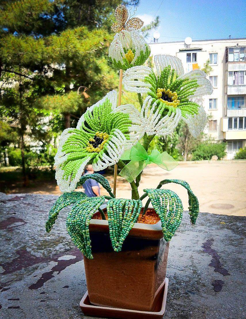 Для того что отыскать вдохновение и найти что-то новое и интересное для себя, вы можете также просмотреть фото готовых работ, на которых изображены различные цветы из бисера в горшочках: