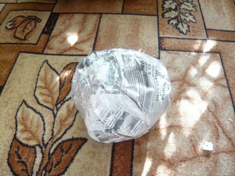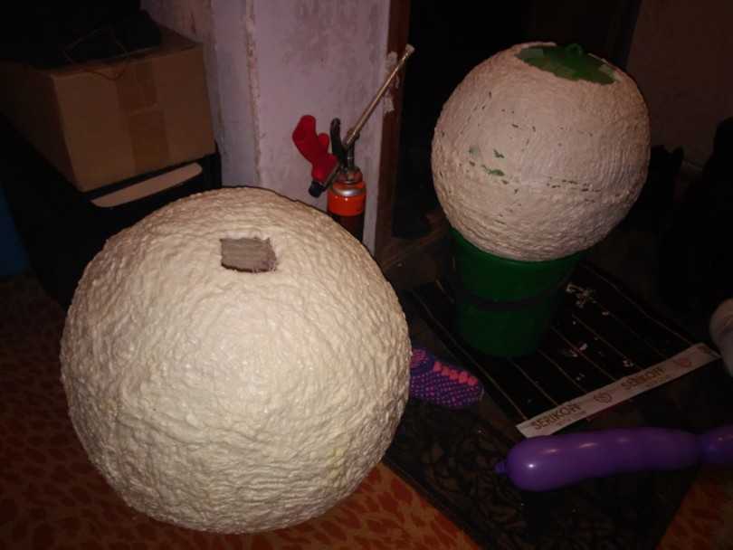 Для экономии пенополиуретановой пены фигуру Колобка не стоит делать целиком из герметика. Идеально взять в качестве каркаса пластиковый мячик подходящего размера и покрыть его пенообразным составом.