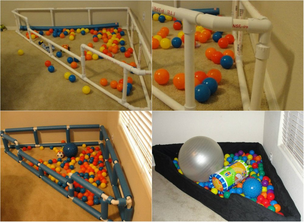 Можно смастерить сухой бассейн из труб ПВХ. Из них же вы сделаете лестницу, чтобы ребёнок забирался внутрь и вылезал оттуда. Стены прикройте синтетической сеткой, чтобы мячи не высыпались оттуда. Вы можете сделать домик для ребенка, создав основу из труб ПВХ. Своими руками затем вы пришьете шторки, которые при помощи шлевок прикрепите к боковинам. Таким же образом прикройте крышу.