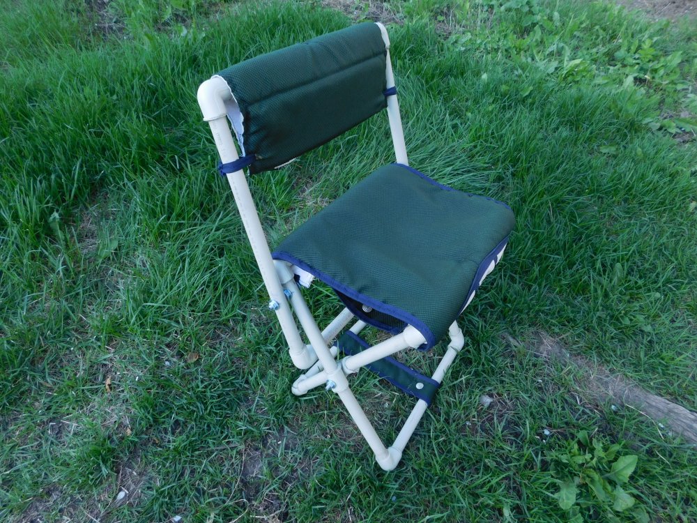 В беседке из труб могут быть пластиковые самодельные стулья. Каркас собирается из коротких обрезков, соединяющихся специальными элементами. После сборки изделие измеряют и шьют сиденье из прочной ткани.