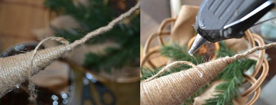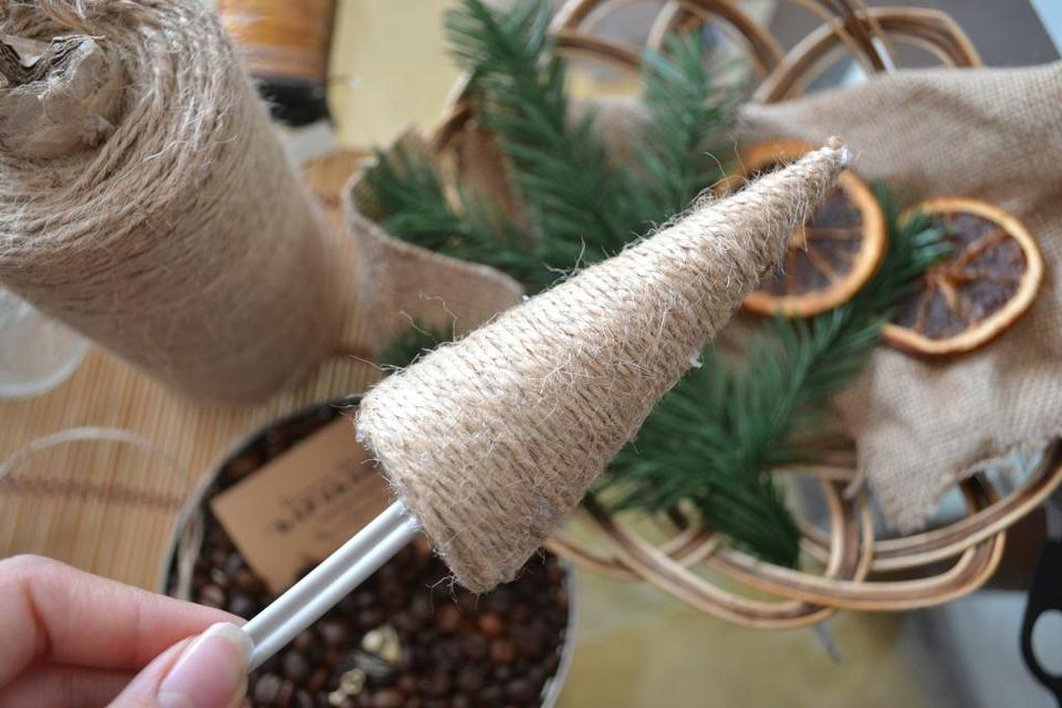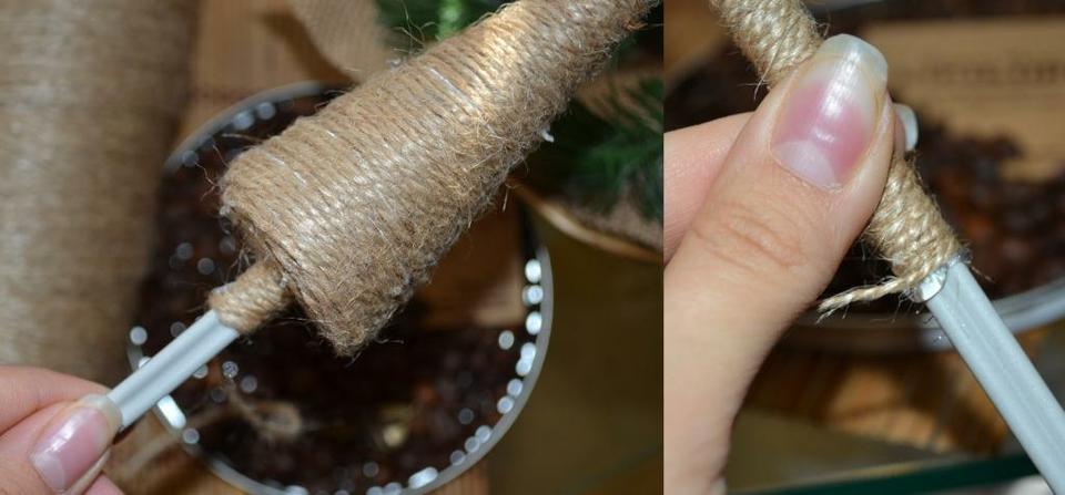 Берем джутовый шпагат и обматываем им основу для елочки.