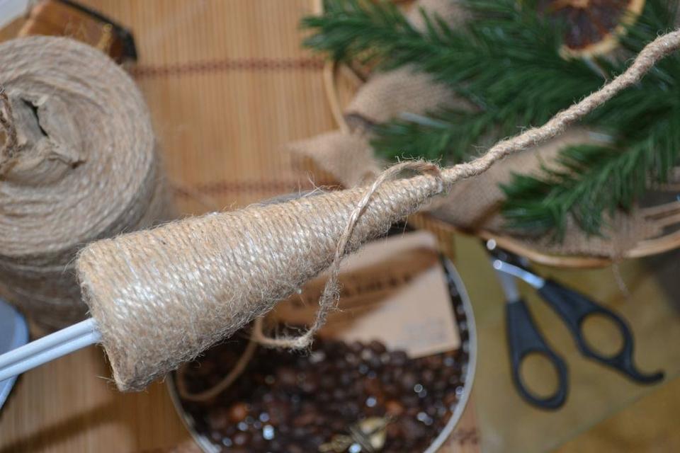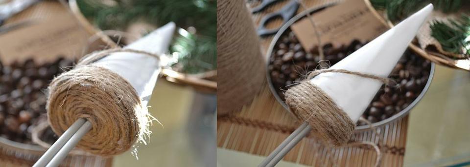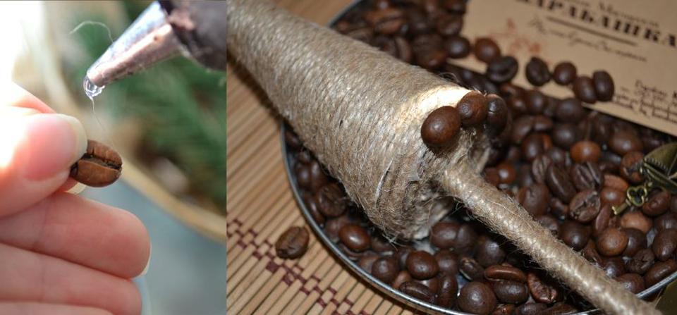 Покройте базу черной краской, чтоб зазоры меж кофейными зернами не кидались в глаза. Также вы сможете пользоваться джутовым шпагатом, чтоб оплести конус. Не забудьте зафиксировать нить клеем, по другому она начнет сползать вниз, и ваша работа будет смотреться неаккуратно.