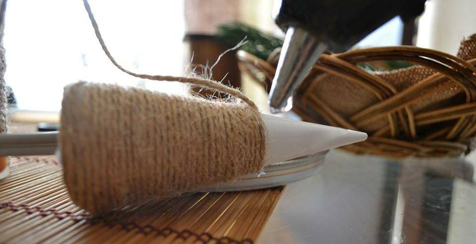 Фиксируем шпагат с помощью клеевого пистолета. Чтобы выглядело аккуратно, делаем это точечно.
