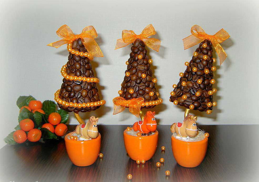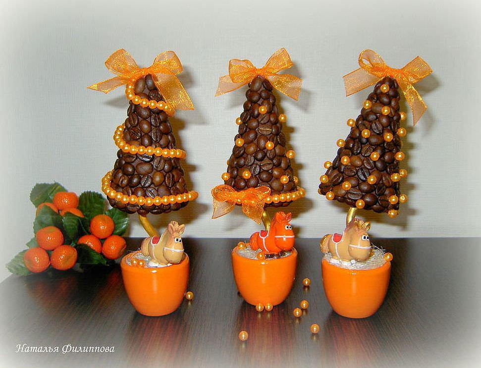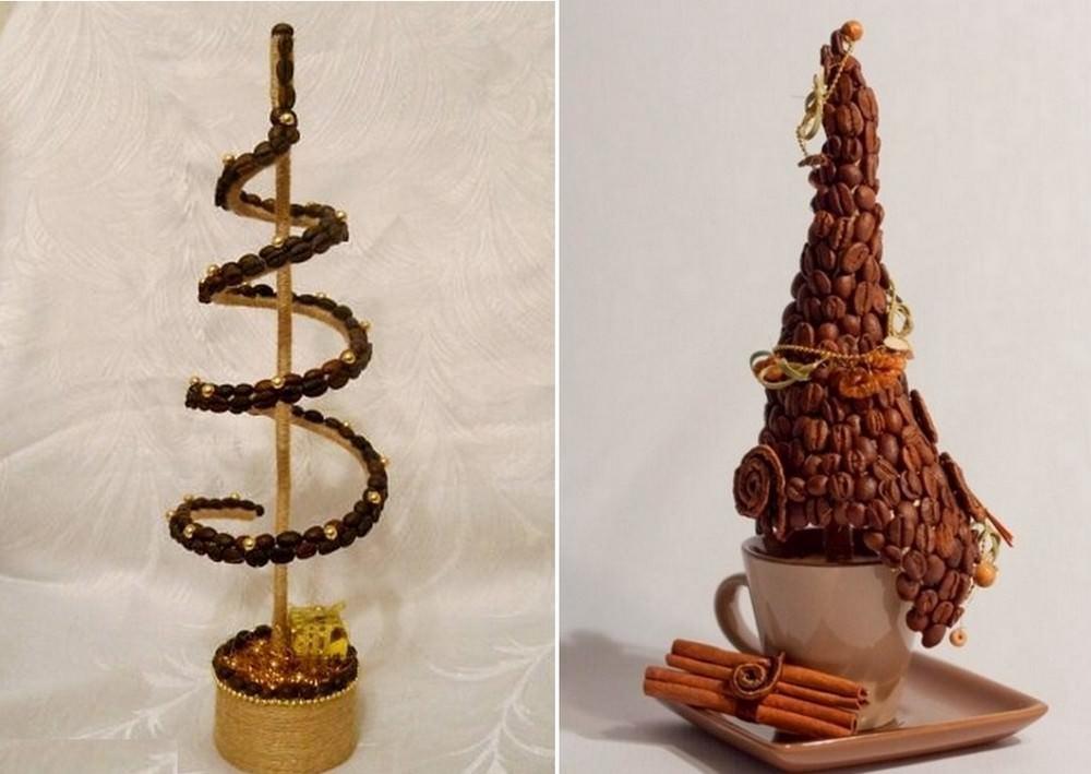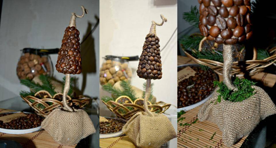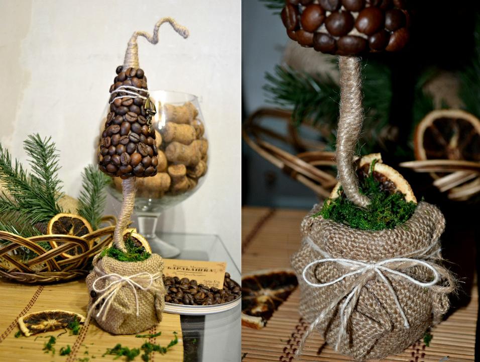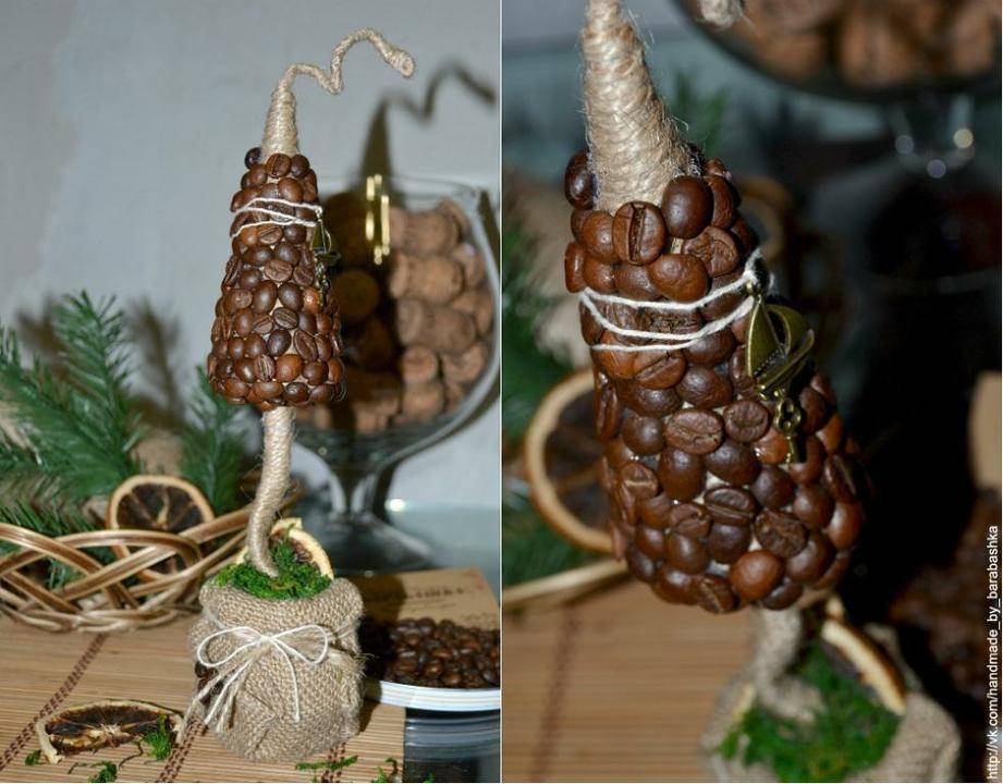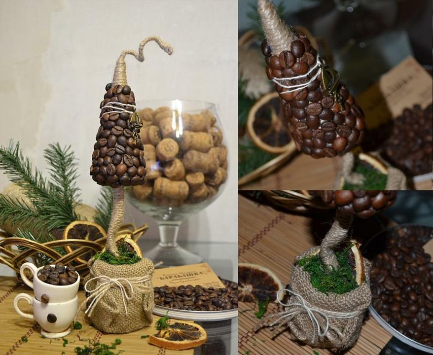 Кто сказал, что рукоделие приемлет только классические форматы? Топиарий елочка может предстать в очень интересном виде, если, к примеру, оформить его с помощью кофе. Этот продукт достаточно часто используется в рукоделии, поэтому такой выбор не вызовет ни у кого удивления.
