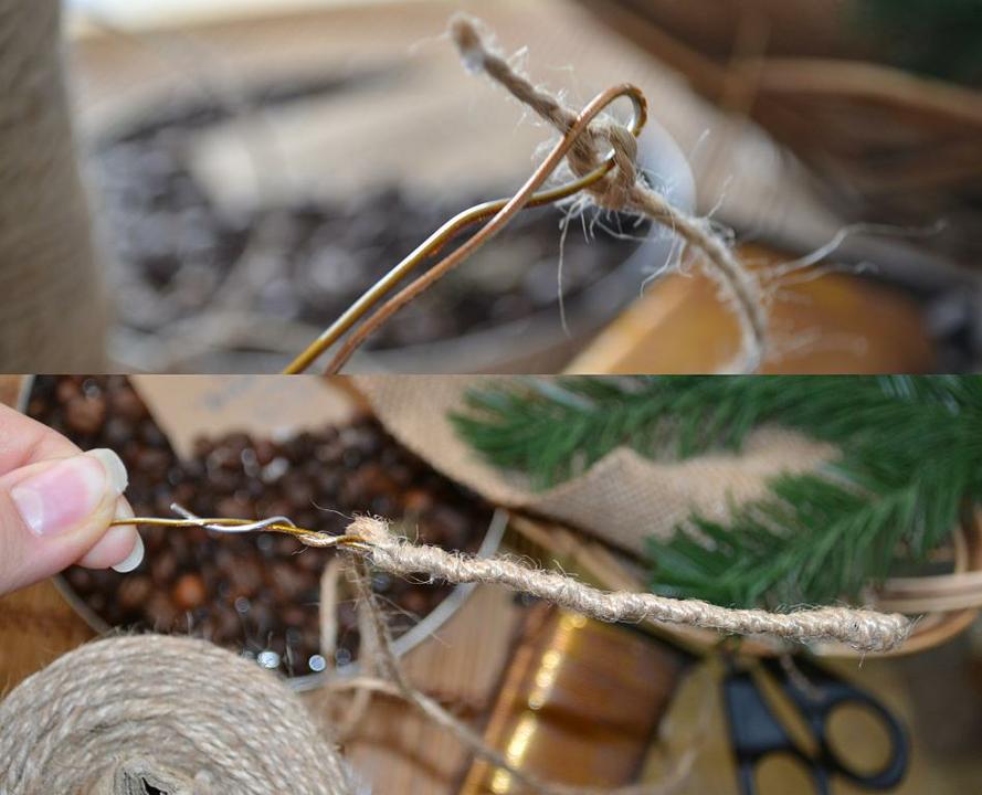 Продеваем шпагат в «ушко», которое у нас получилось, и завязываем узелок, потом обматываем проволоку джутом по всей длине.