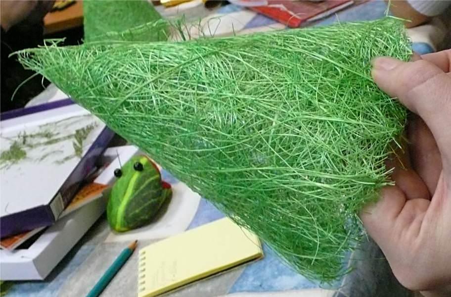 Далее приступают к оформлению кашпо и конуса в стиле праздника. Подставку можно обернуть красивыми бумажными салфетками и наклеить на них дождик и мишуру. Конус по спирали оборачивают яркой атласной лентой и укрепляют на нем елочные игрушки, конфеты, декоративные украшения. Можно выбрать различные варианты эффектного оформления новогодней елочки. Для фиксации декора используют декоративные булавки. Елочка из ниток и сизаля — отличное украшение к празднику.