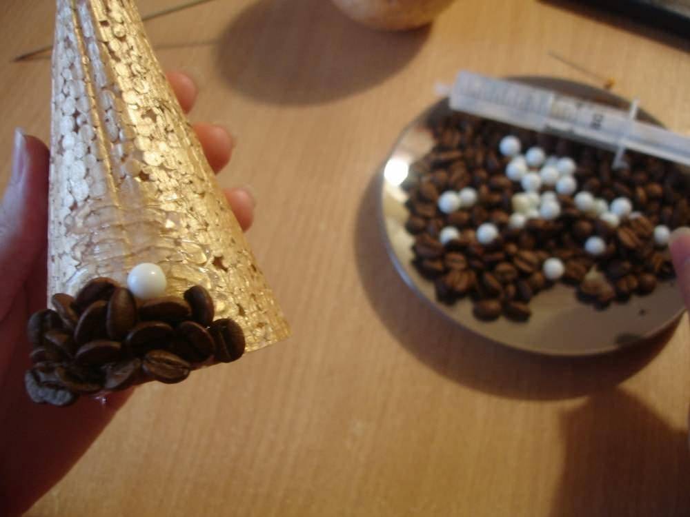 Теперь вам необходимо набраться терпением и обклеить основу для елки кофейными зернами. Зерна приклеивайте при помощи клеевого пистолета под углом приблизительно 70-80 градусов. Начинать клеить нужно с основания елки, а не с вершины. После того, как елка покроется своей «одежкой», ее необходимо украсить, ведь новогодняя елочка из кофе без украшений – это неинтересно. Для украшения подойдут красивые бусинки, бантики, блестки – все, что вы придумаете.