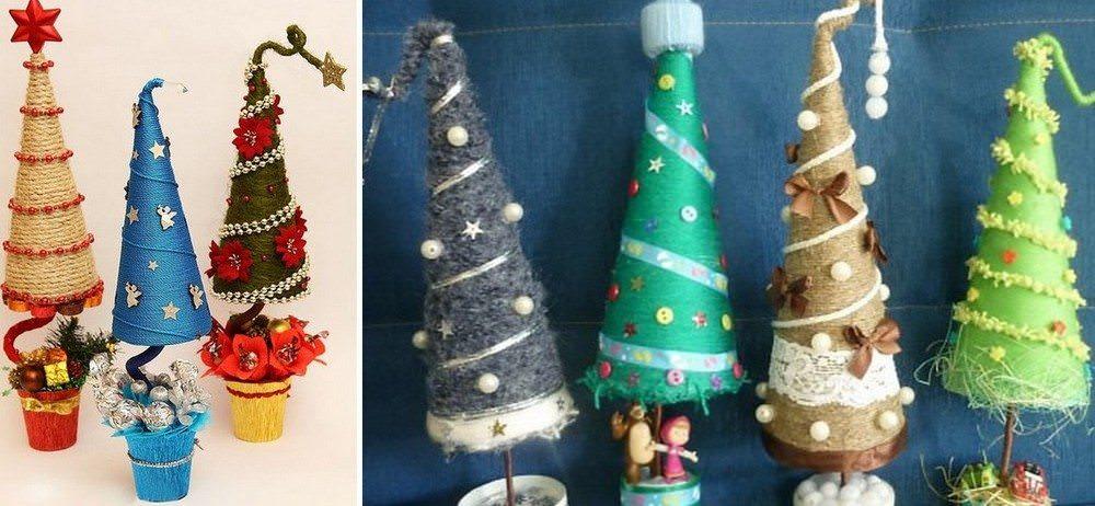Такие импровизированные елочки украшают в соответствии со стилем праздника. Подойдут мишура, шишки, конфеты, символы года, миниатюрные мягкие игрушки, елочные гирлянды. Для создания такого сувенира не требуется пошаговая инструкция, вполне достаточно собственной фантазии.
