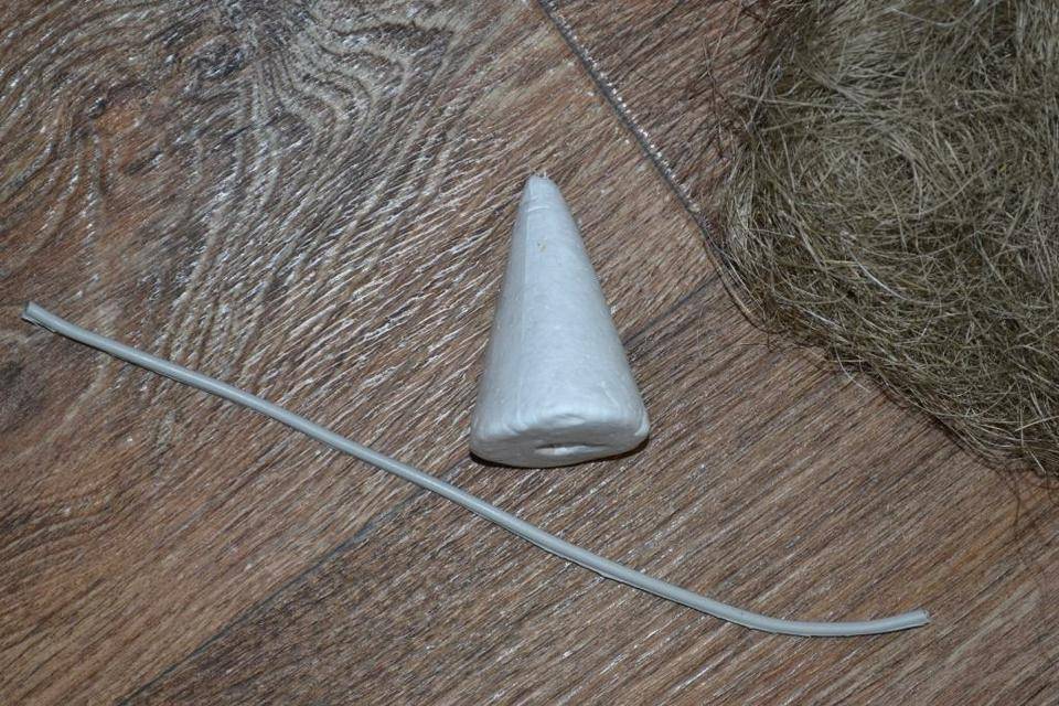 Берем пенопластовый конус и проволоку. В конусе делаем отверстие, аккуратно вставляем в него проволоку.