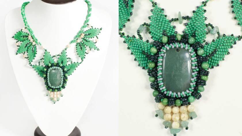Нимфа — по этому изделию есть целый курс. На нем, мы учимся обшивать кабошон, делать трубочки мозаичным плетением и работать в смешанных техниках японским бисером. В итоге у вас получиться впечатляющее украшение.
