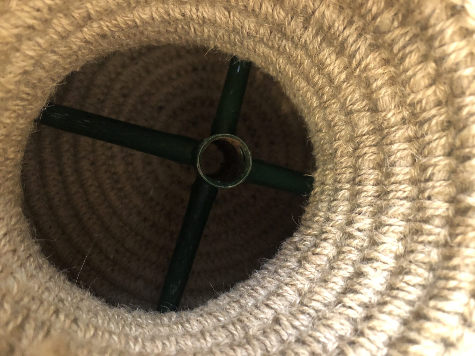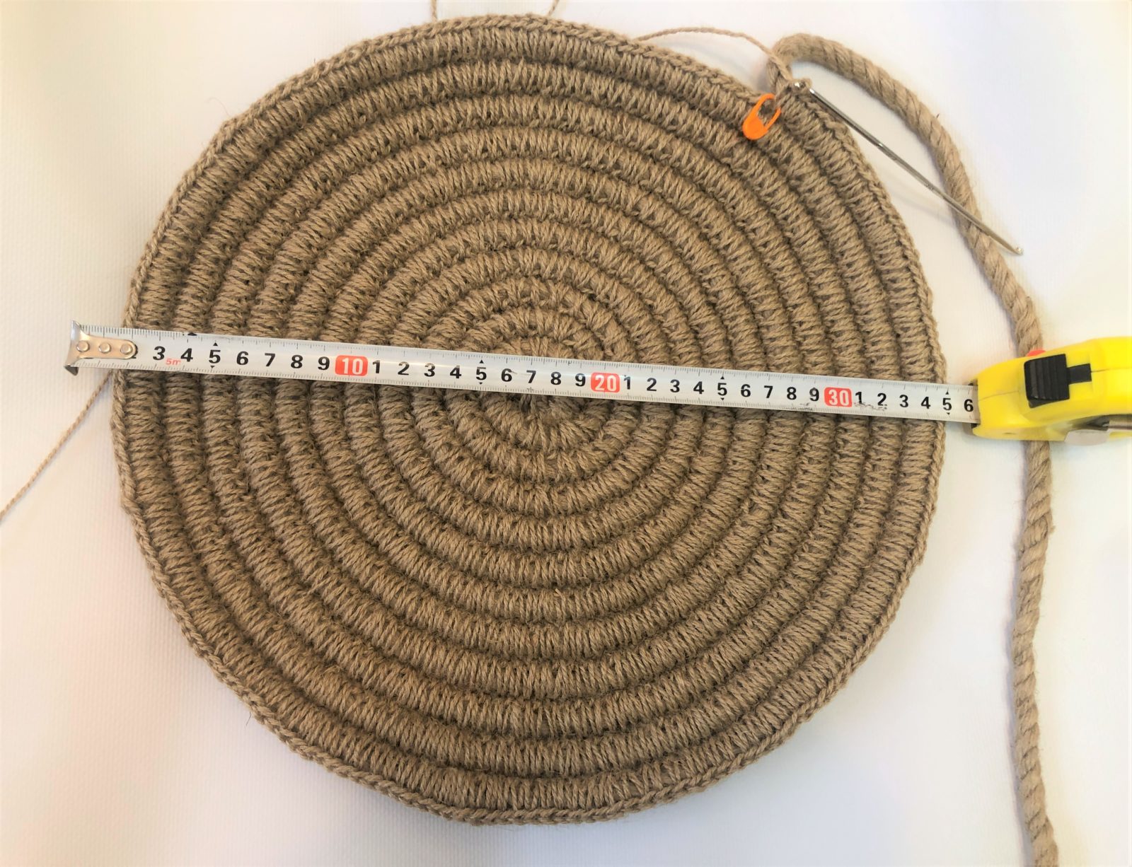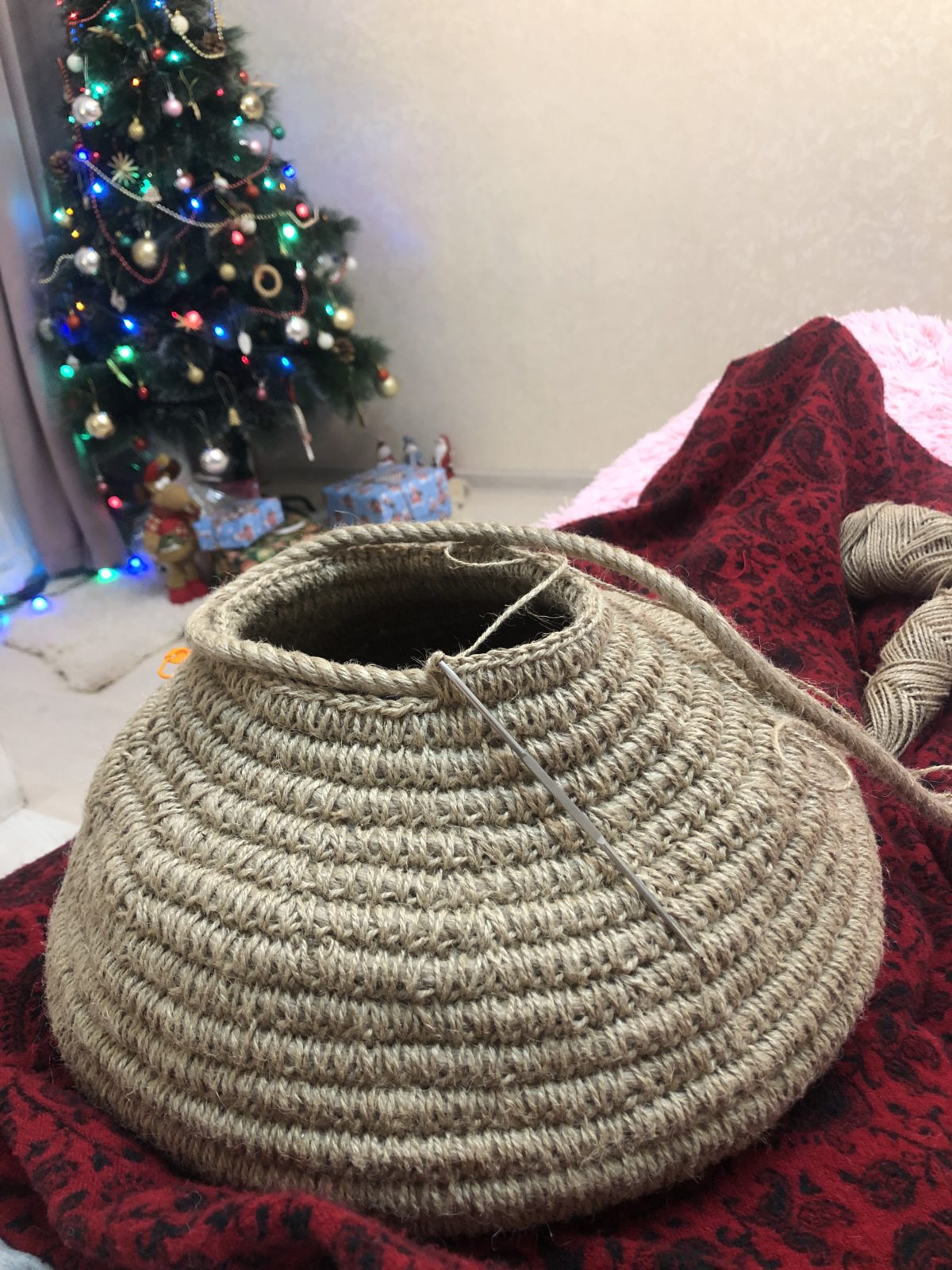 Диаметр вяжется ровно также по описанию выше. Но в этой корзине он у меня 35 сантиметров. Я померила ножки искусственной новогодней елки, их длина – около 30 см.