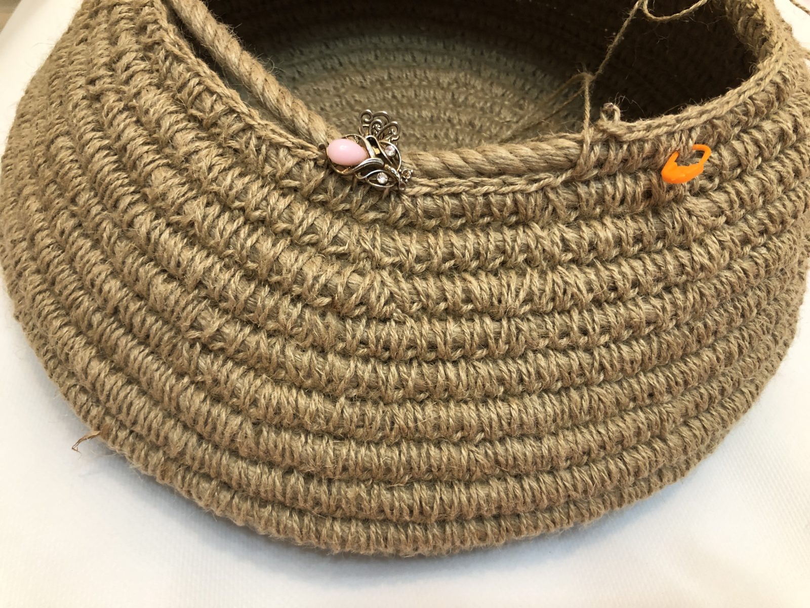 Точно также поднимаем корзину вверх, передвигая канат соответственным образом и вывязывая только одну часть столбика предыдущего ряда.