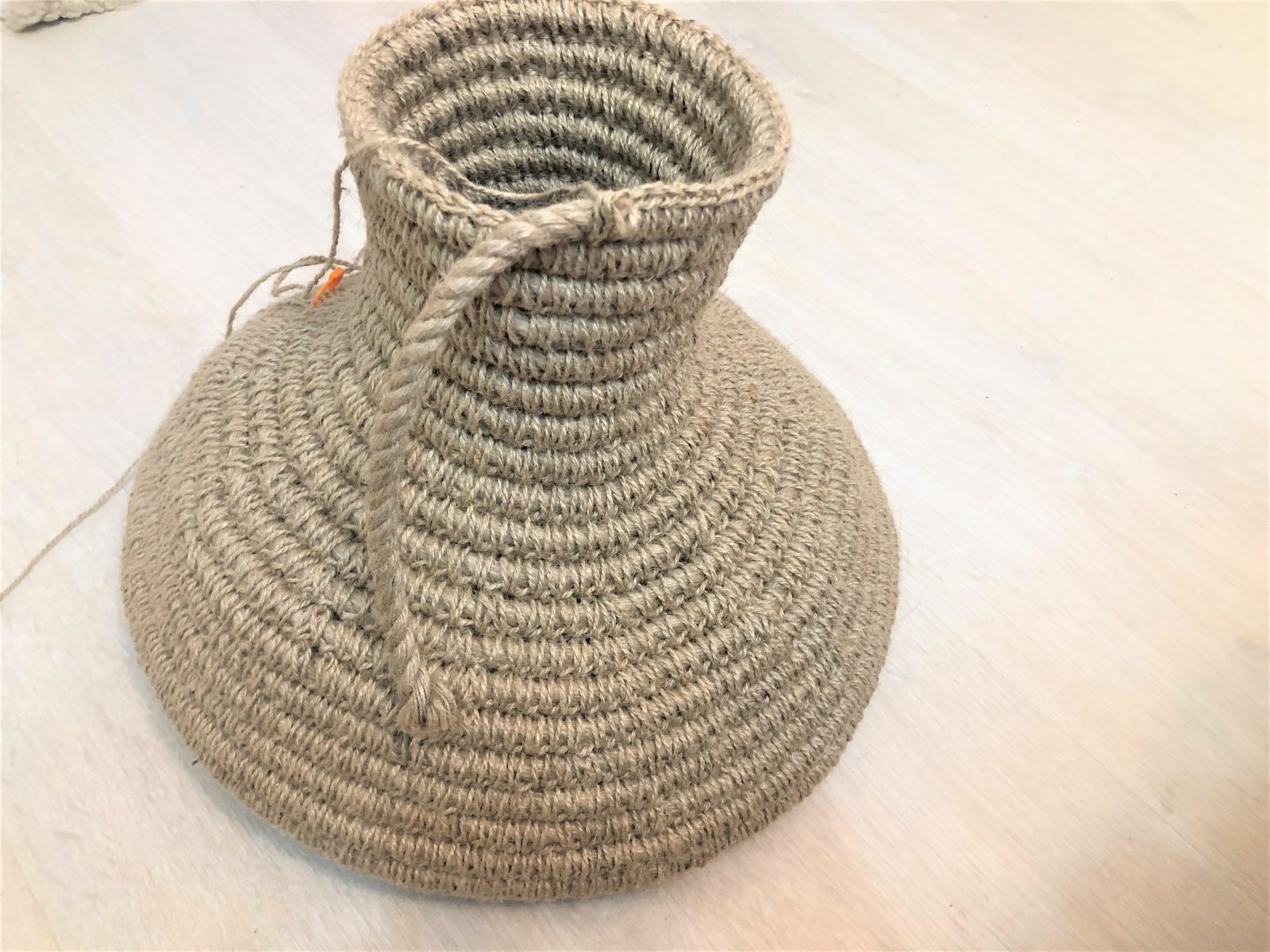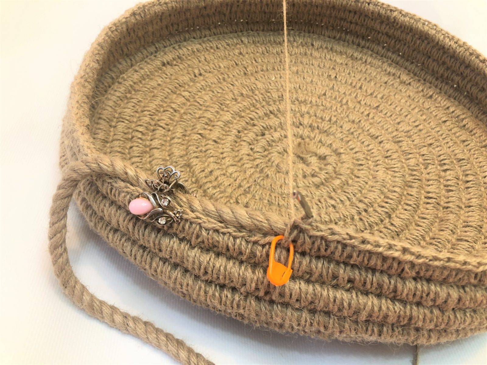 Готовую джутовую корзину, связанную крючком, можно украсить и «именовать» биркой. Красиво смотрится из коричневой кожи.