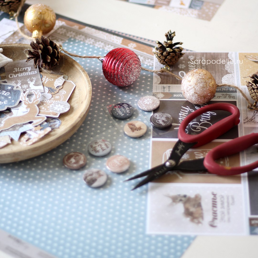- Перед тем, как наклеивать скрапбумагу, подложку и украшения из «обрезков», нужно всё примерить. Желательно оформлять не по одной странице, а сразу две на развороте.