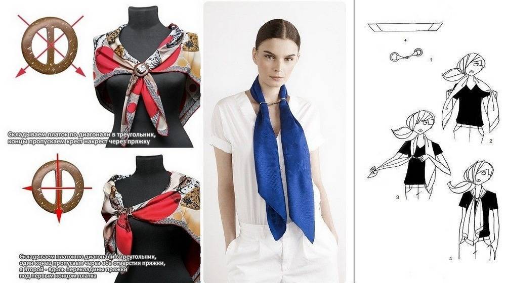 Для тех, кто не любит узелки, можно воспользоваться специальными зажимами и кольцами. Впрочем, ими можно дополнять и узелковые варианты завязанного шарфа или платка. Так можно носить и на верхнюю одежду, и в летнее время. На основе уже существующих примеров можно запросто создавать что-то собственное, придумывая, как завязывать лёгкий или объёмный аксессуар каждый раз заново и красиво.