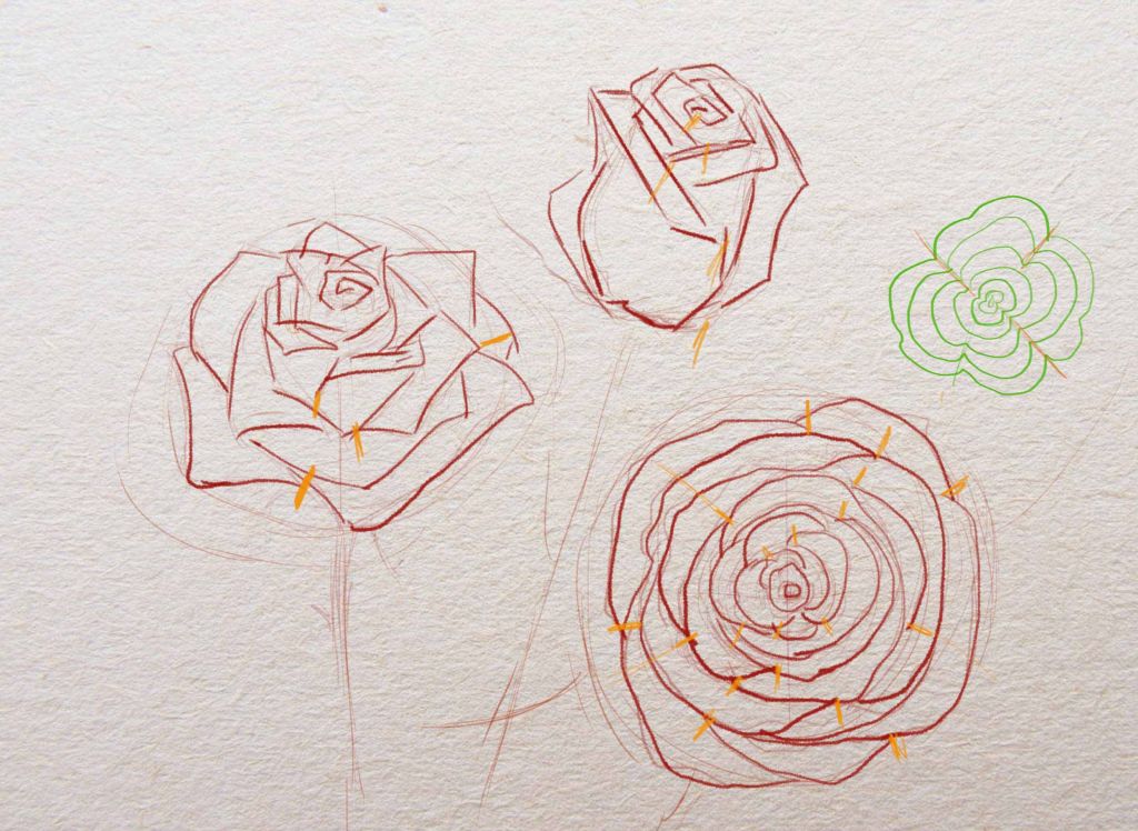 На рисунке выше угловатость подчеркнута оранжевым цветом. Для большинства ракурсов и углов «угловатость» отлично работает. Для последнего цветка это правило не применялось, хотя можно немного очертить линиями, с широкими тупыми углами. Хотя в таком ракурсе проще сразу очертить закругленные лепестки, которые равномерно расходятся от центра.