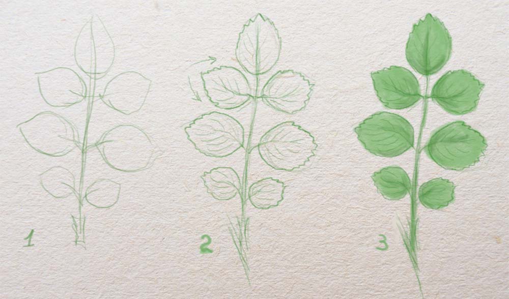 Потренируйтесь изображать листья по этой схеме, чтобы в дальнейшем они легко и непринужденно раскрывались в более сложных композициях.