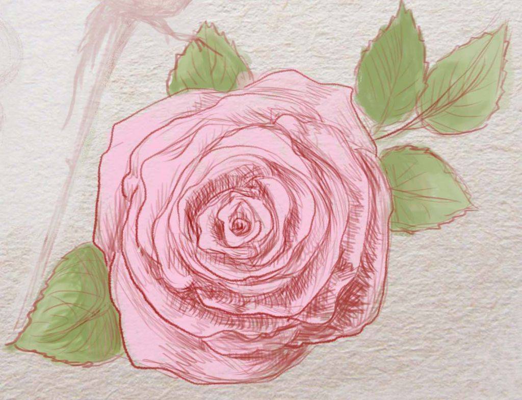 Теперь начинаем разукрашивать нашу работу. Для штрихования розы используйте мягкие цветные карандаши разных оттенков красного: малиновый, алый, розовый. Самый темный тон — в основании лепестка.
