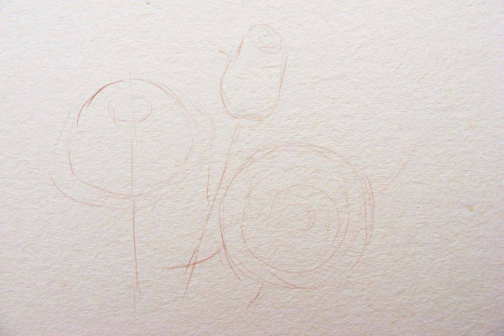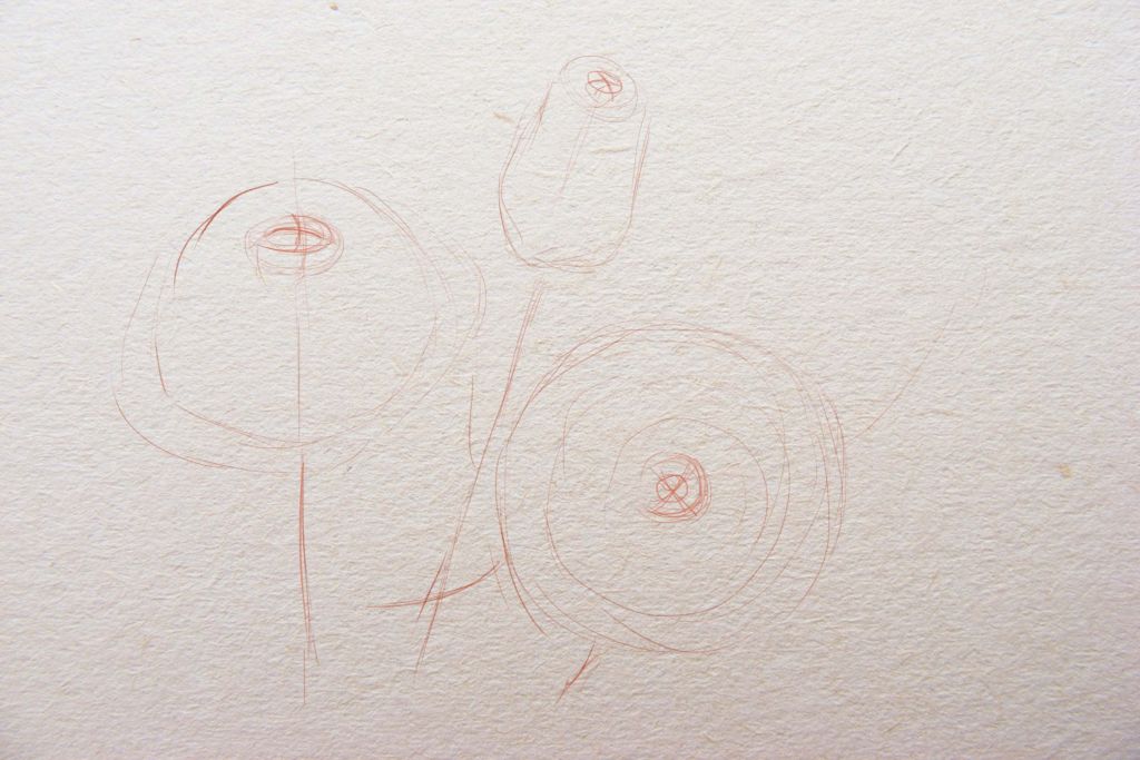 - На этом же этапе необходимо наметить стебли, определить центр цветка. На иллюстрации ниже центр очень приблизительно очерчен, но на самом деле это нужно делать еле заметными штрихами.
