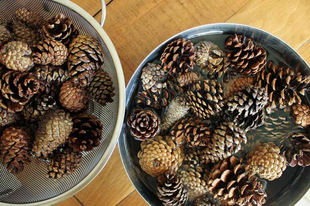 Обработка в уксусном растворе должна продолжаться около тридцати минут. Но точное время зависит от общей чистоты природного материала. Если шишки были чистыми изначально, например, собраны с веток или в чистое сухое время, достаточно 25 минут вымачивания. Но когда пришлось приступить к сбору в сырое время, а на шишках было очень много грязи, лучше подольше держать их в растворе, чтобы погубить микроорганизмы. В таком случае можно вымачивать их до сорока минут.