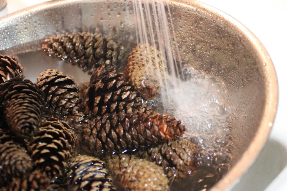 Прежде чем приступить к процессу отбеливания, шишки необходимо очистить от грязи, мусора и смолы. Капельками смолы обычно покрыты все шишки. Если оставить смолу, со временем шишки потемнеют. Для очистки воспользуемся щелочью. Она омыляет смолу.