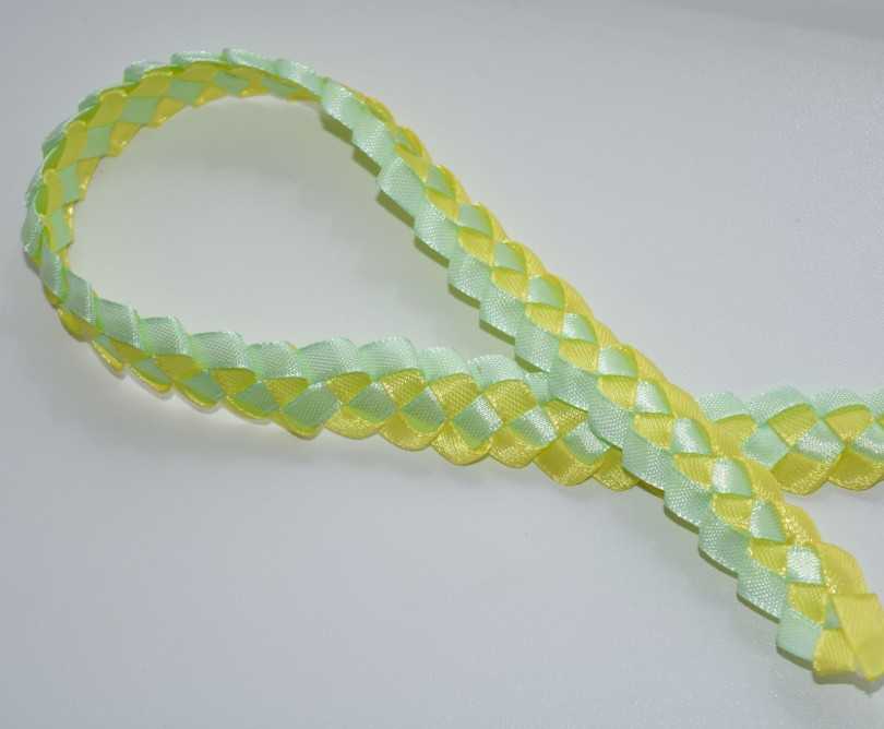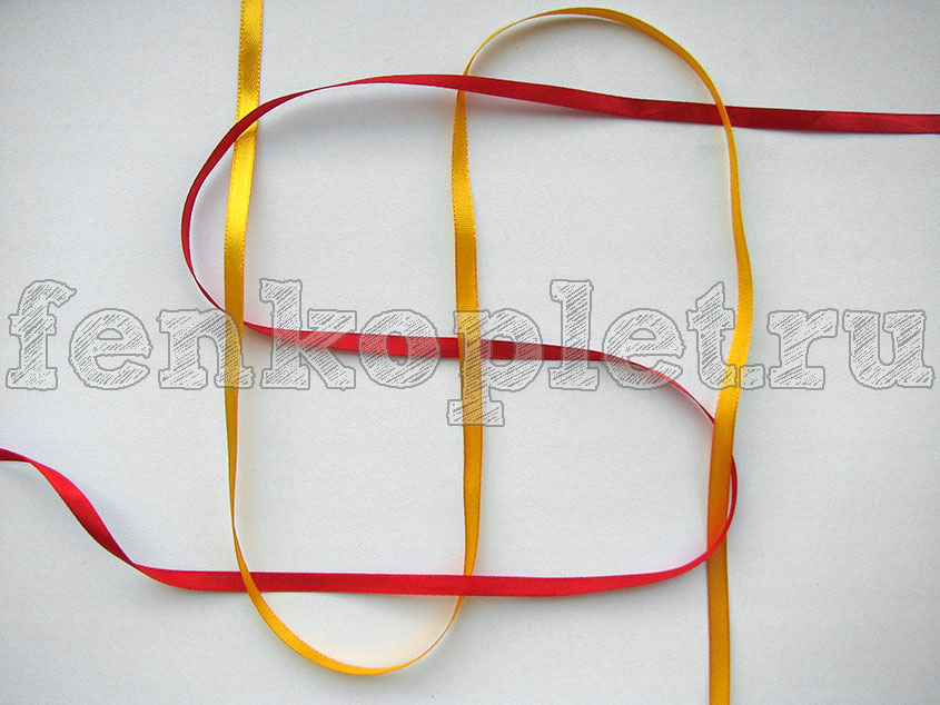 Для работы над будущим браслетом нужны атласные ленты двух цветов. Помните о принципах сочетания цветов. Сегодня в интернете можно без труда найти специальные таблицы, которые помогают научиться гармонично совмещать цвета. Но для первого раза можете взять два цвета, один из которых жёлтый. С ним прекрасно сочетаются такие цвета как красный, синий и зелёный.