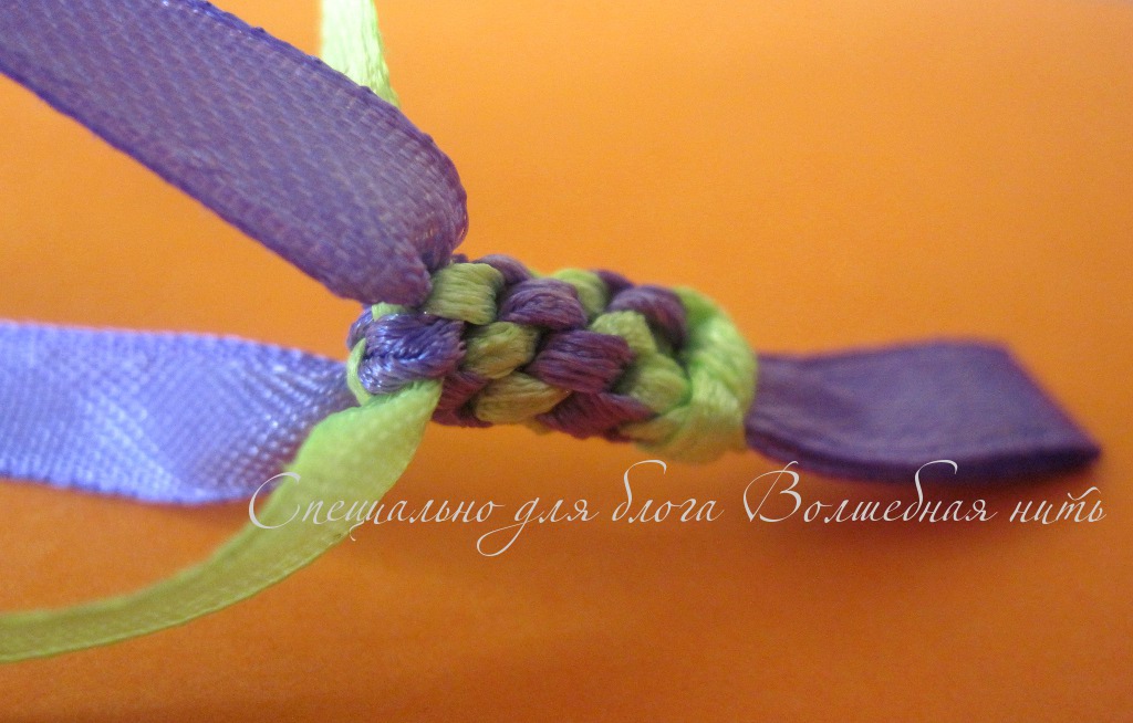 Если вы плетете на 4-х лентах то свяжите их края оставив свободный кончик в 5-10 см.