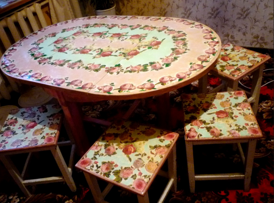 Кухонный. Для декупажа кухонного стола используются прочные материалы, которые легко моются, поскольку на эту мебель на кухне часто воздействует агрессивная среда.