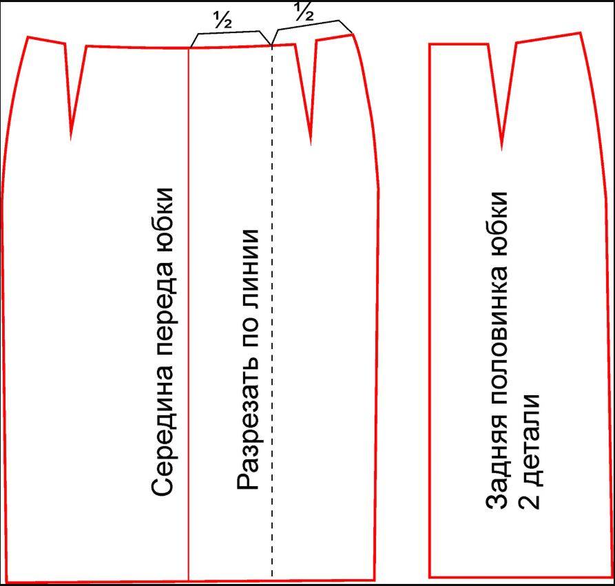 Для юбки карандаш с разрезом проводим вертикальную линию и разрезаем выкройку.
