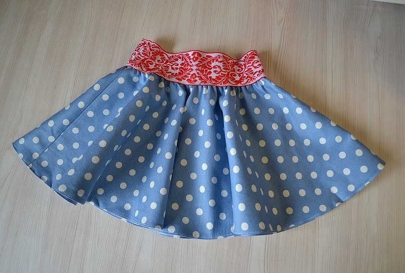 Если нужно пристрочить к изделию ленту с декоративным краем, например, для детской юбочки, то следует применять основной принцип пришивания тесьмы, то есть наложить ее с верхнего края юбки на лицевой стороне.