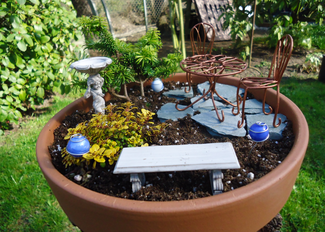 Стол, стул куклы так же прекрасно впишутся в живописную картину. Небольшой водоем сделайте из нижней части пластиковой бутылки или из маленькой миски. Можно купить миниатюрную ажурную арку или смастерить ее из гибкой проволоки. Затем изделие покрывается краской, а когда она высохнет, устанавливается в мини садике.