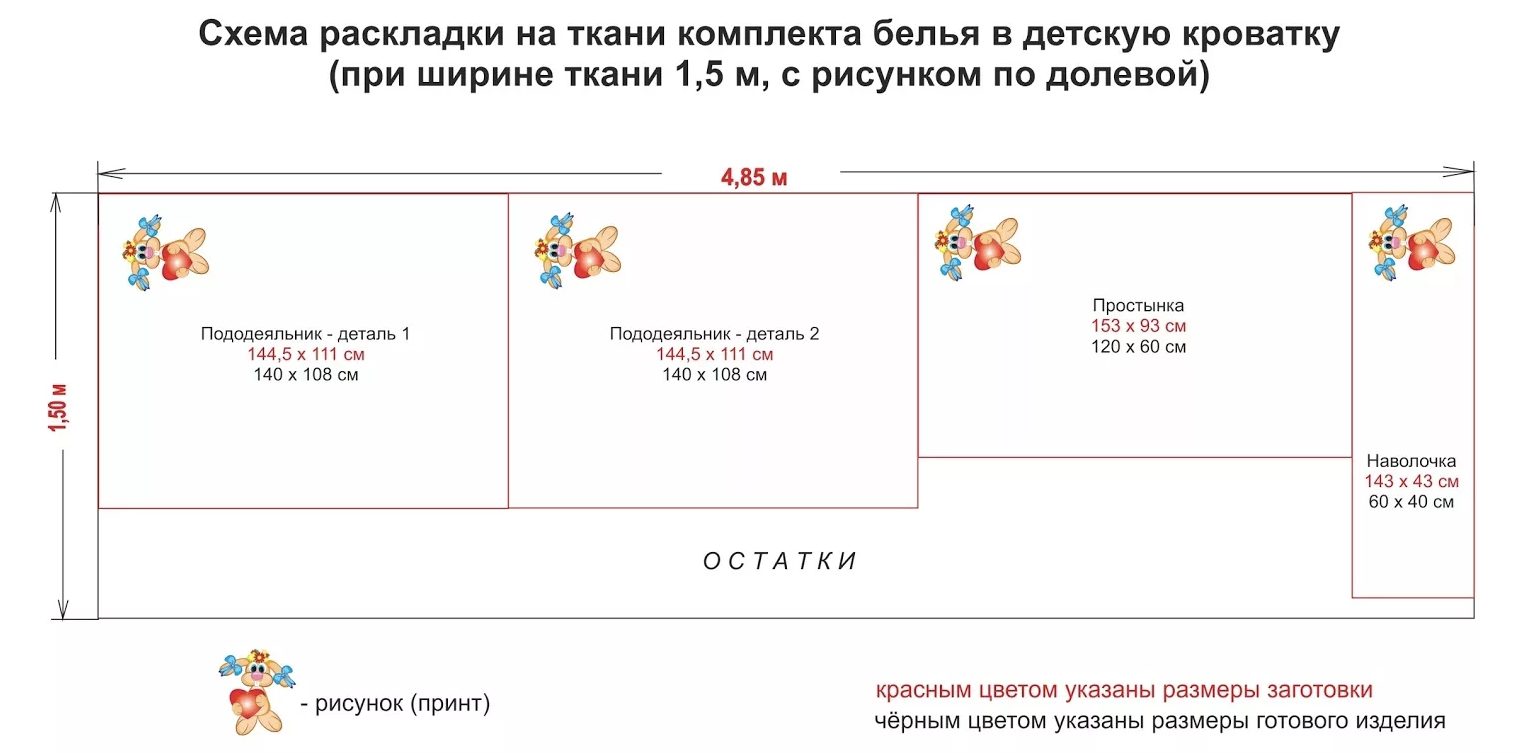 Постельное белье в кроватку удобнее шить из ткани шириной 150 см. Именно поэтому производители выпускают полотно с детскими рисунками только в этом размере