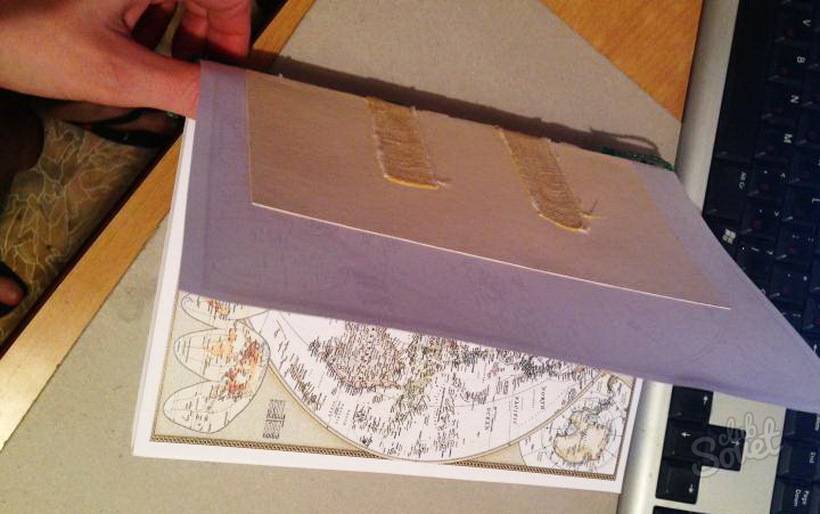 - Пока заготовка высыхает. Можно заняться обложкой Обтяните ее тканью или украсьте в той технике, которая вам нравится. Заготовку соединяем с обложкой с помощью клея и снова кладем под пресс.