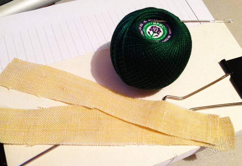 - Затем уберите зажимы и возьмите длинную нить и две полоски плотной ткани.