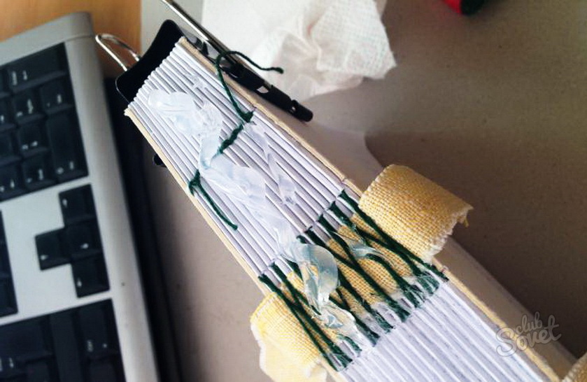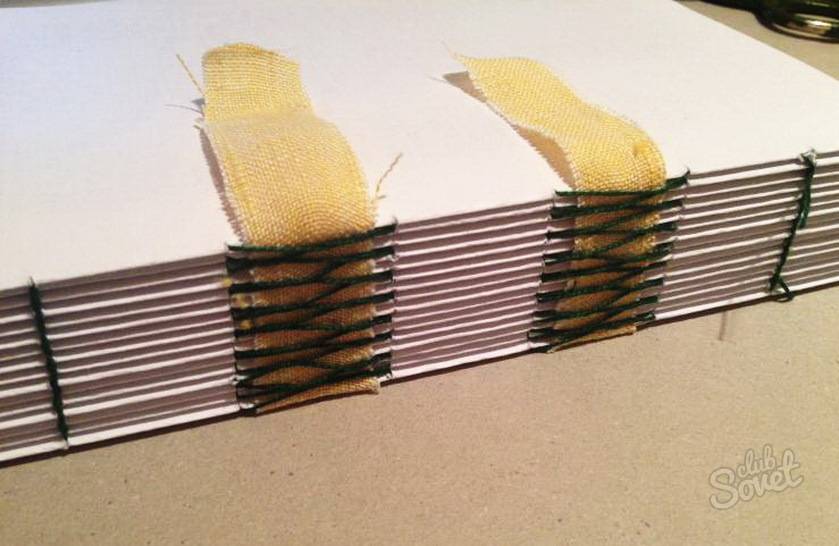 Каждую тетрадь из 8 листов прошейте вдоль по сгибу, посередине между стежками проложите ткань.