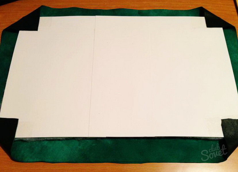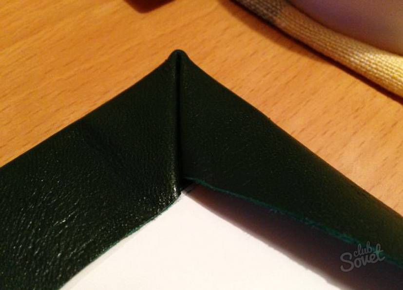 На уголки картона приклейте двусторонний скотч и заверните уголки кожи вовнутрь.