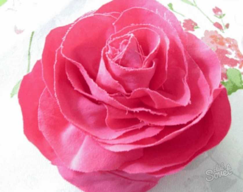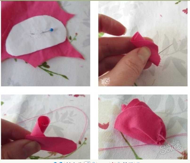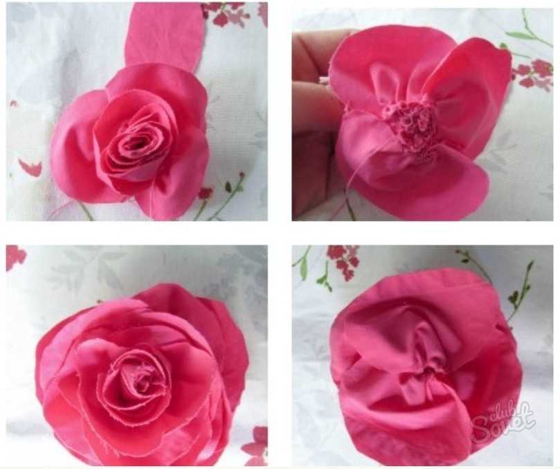 - Чтобы сделать розу, начинайте сборку с самого малого лепестка. В центр для полноты, можно разместить сжатый кусочек ткани. После того, как вы собрали спираль из нескольких лепестков, закрепите их с помощью нескольких стежков.