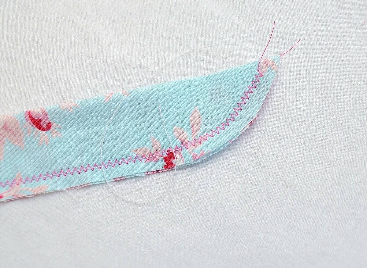 Толстую нить вденьте в иглу для ручного шитья и пропустите под стежками зигзага. Соберите полоску на нить.