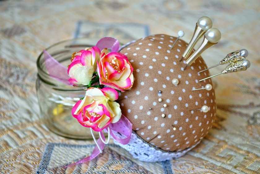 Законченность аксессуару придадут воткнутые в него иголки и булавки.