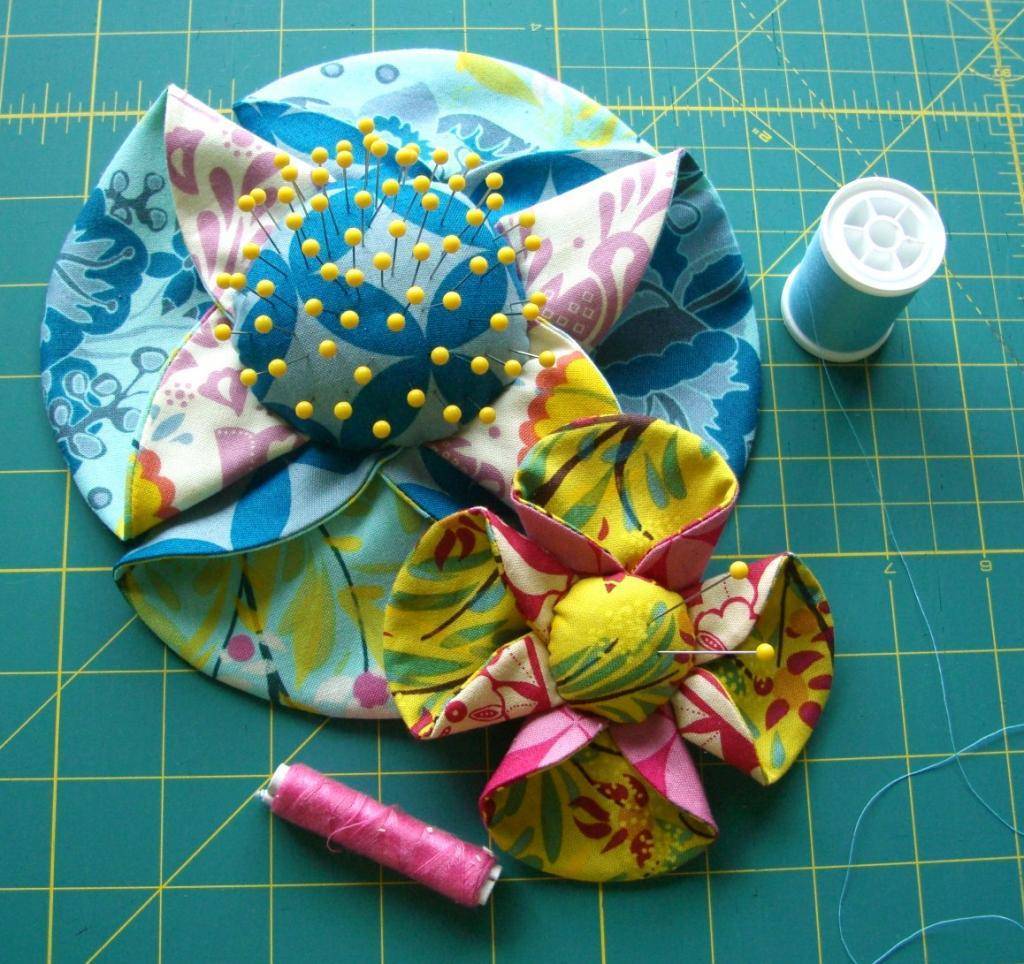 Сшиваем четвертинки между собой, разутюживаем припуски на швы. Складываем два круга лицом к лицу, сшиваем их вместе, оставив совсем немного места для того, чтобы вывернуть и набить подушечку.