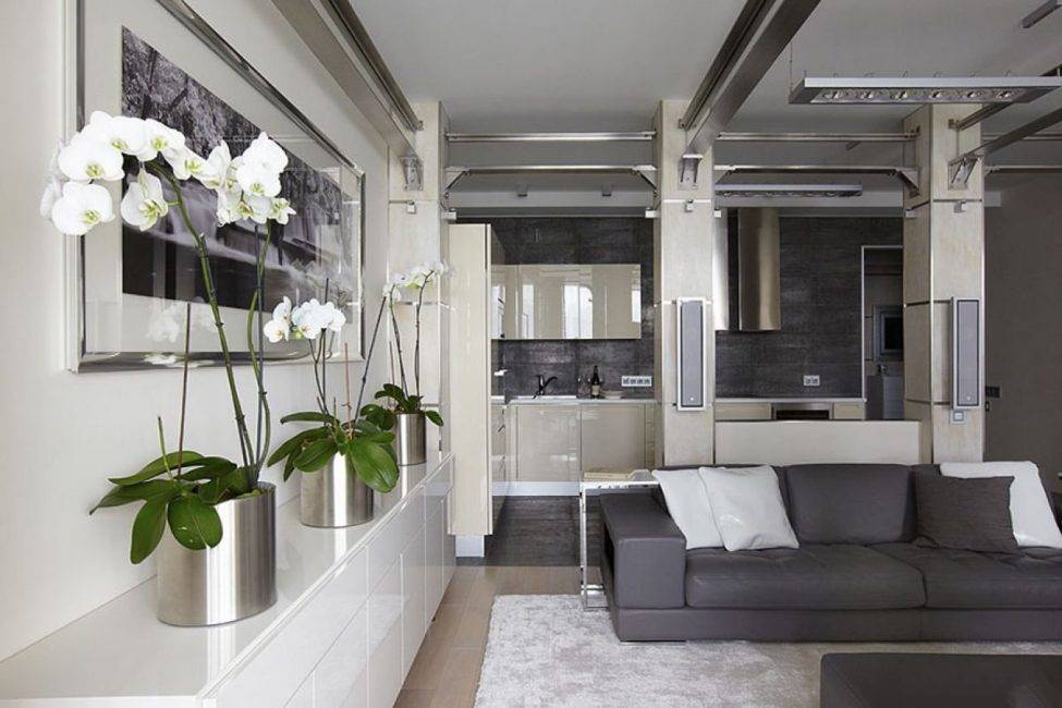 В крупногабаритных гостиных хорошо смотрятся большие растения, в том числе и пальмы или цветы в высоких вазах. В таких комнатах также можно разместить несколько композиций из декоративных «насаждений». В небольших гостиных рекомендуют размещать цветы в компактных вазах или горшках.