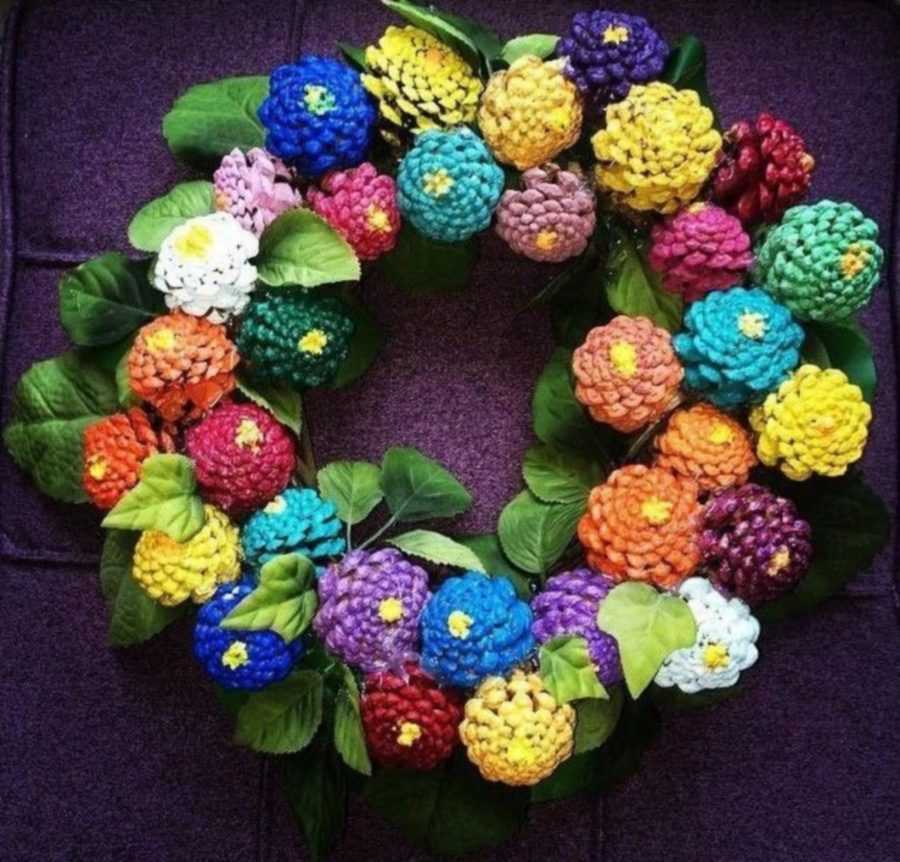 Для изготовления венка потребуется не один вечер, ведь природные материалы необходимо: покрасить, высушить приклеить на круглую основу и при необходимости покрыть лаком.