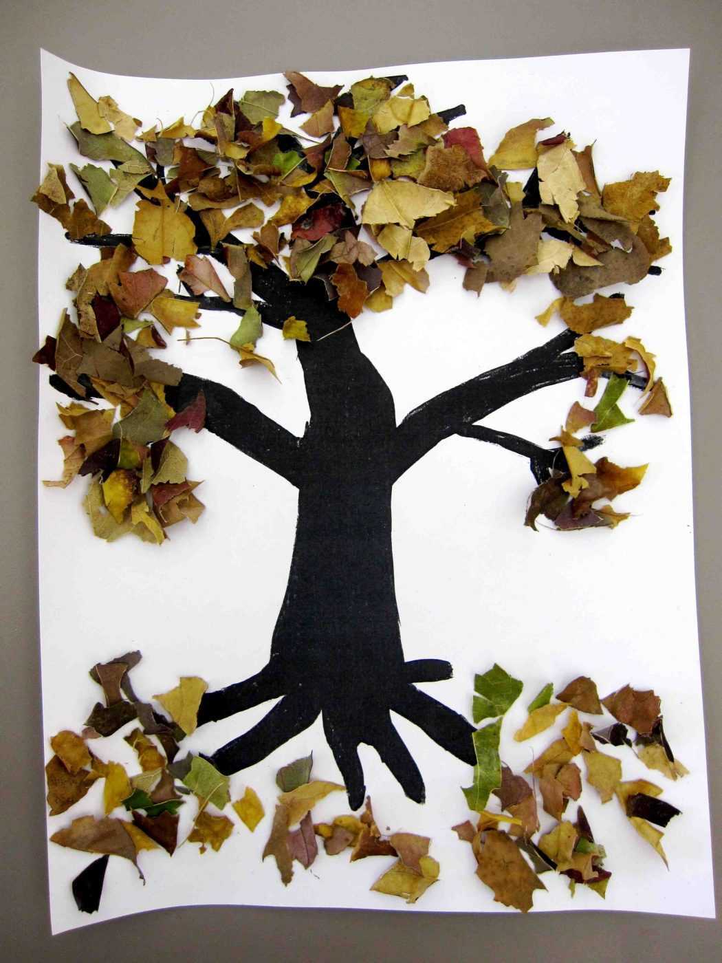 Чего не хватает, конечно же разноцветных листьев! Вырежьте их красными, желтыми и зелеными цветом.