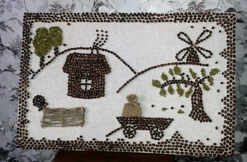 Самым простым вариантом поделки с применением зерен кофе является декоративное панно. Учитывая, что аромат кофе ассоциируется в первую очередь с утренним пробуждением и бодростью, тематика панно должна быть соответствующей.