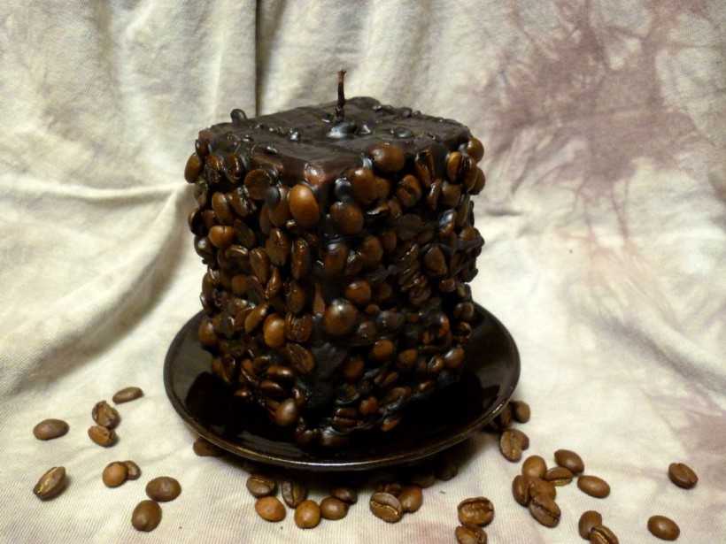 • Серединку для банта сделайте из кофе, но только выбирайте зерна округлой формы. Готовую свечу можно упаковать в прозрачную бумагу, чтобы виден был декор.