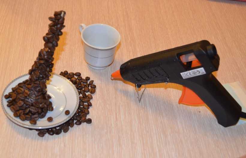 - Пистолет с термоклеем. Все поделки так или иначе предусматривают крепление зерен, и удобнее это делать именно специальным клеем. В крайнем случае, может подойти ПВА, но он оставляет белые разводы и не слишком хорошо держится. Суперклей обычно слишком быстро сохнет, пачкает руки и зерна, а кроме того, долго пахнет, перебивая запах кофе.