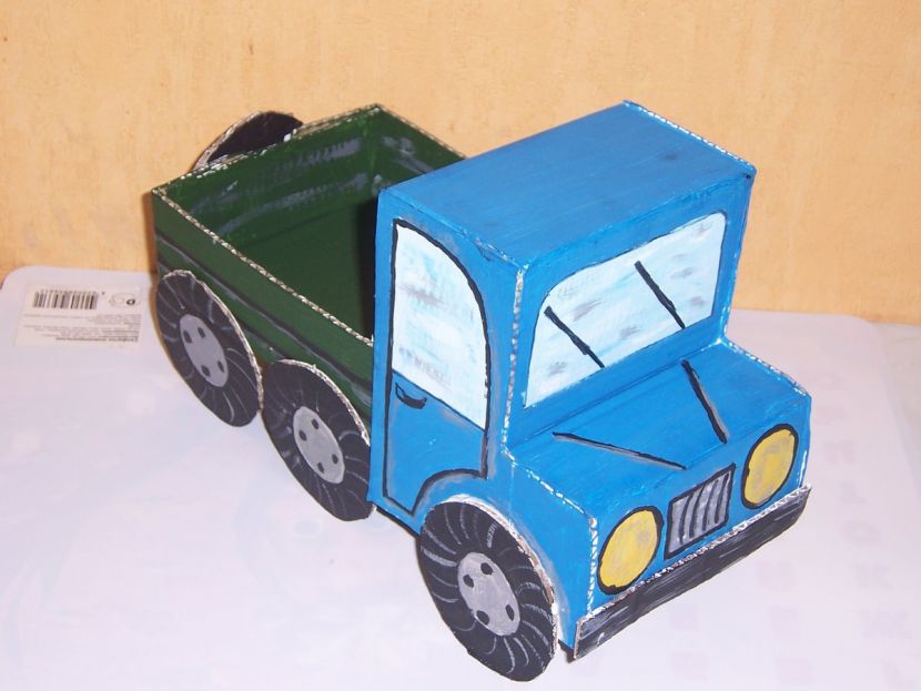 - по аналогии грузовика, делаем кабину и кузов, но в этом случае картон должен быть зелёного цвета;