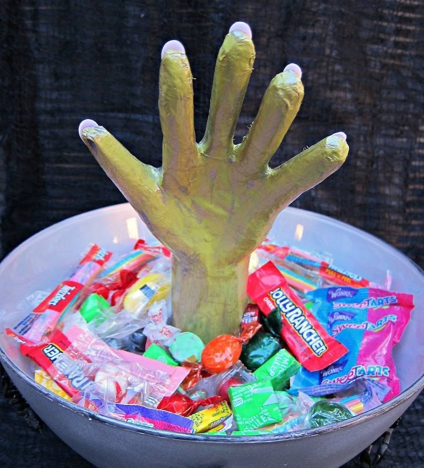 За основу можно взять готовую маску, доработать детали с помощью пластилина, например, увеличить надбровные дуги, сделать бородавки и морщины. Затем заготовку обмазать массой из бумаги с клеем и оставить высыхать на сутки, после чего декорировать кусочками ткани, имитирующими кровь, кружевами и марлей.